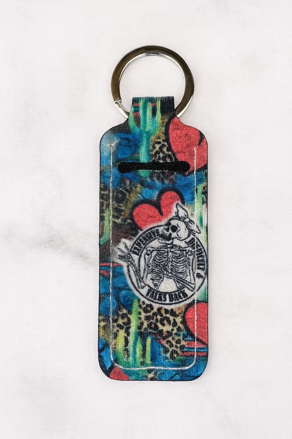 Bold and edgy, this lip balm holder mixes leopard print, red hearts, and green cactus accents with a skeleton graphic. Perfect for anyone who loves a little sass and western vibes in their accessories.